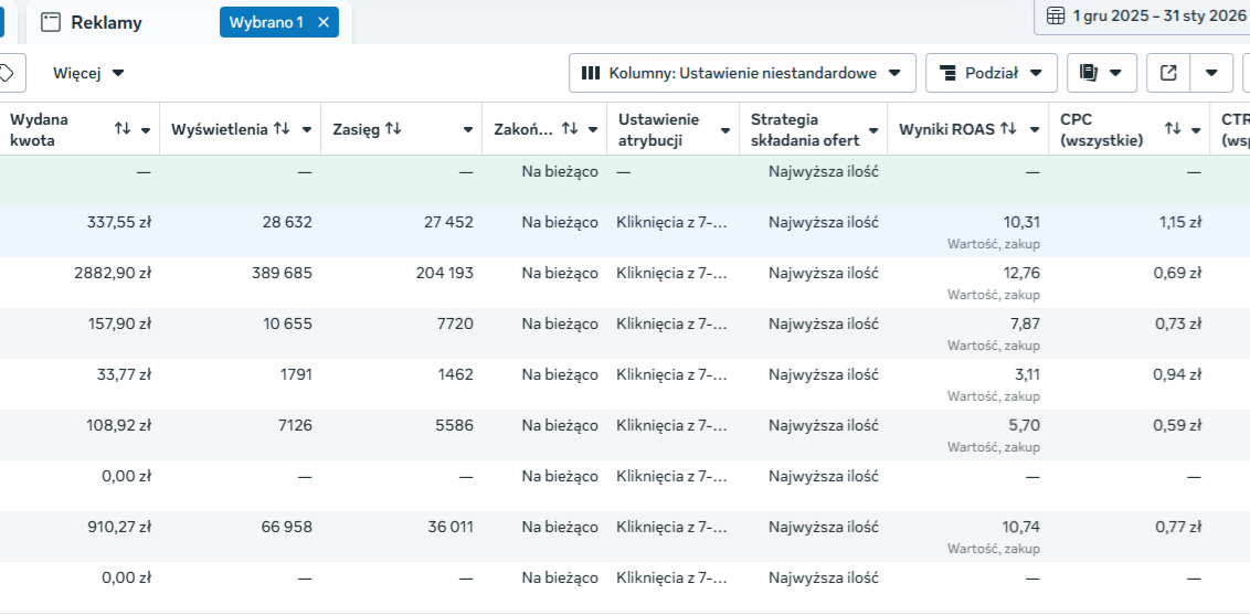 Po zmianie struktury kampanii, targetowania i optymalizacji reklam zgodnie z materiałami z kursu wynik wzrósł do ponad 10x.