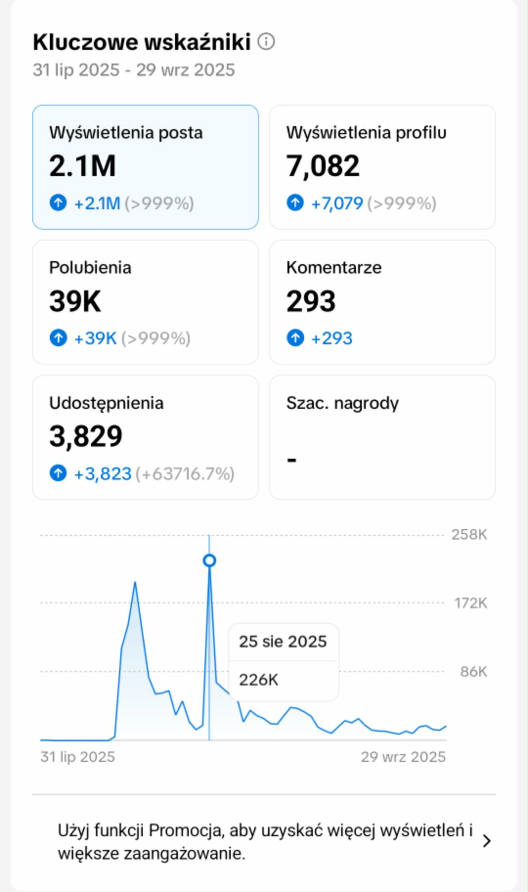 Jedno wideo wygenerowało 226k wyświetleń w 24 godziny, a cały profil przekroczył 2,1 mln wyświetleń w niecały miesiąc.
